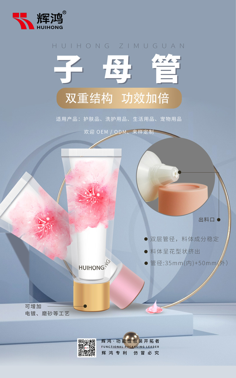 【工艺设计特点】:内/外管分装不同料体,盖子设计两种料体出:使用时出料口混合,可挤出一朵花型;双管齐下,功效倍增,需先锁盖,尾部灌装